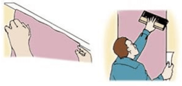 Comece aplicando o papel no teto. Espere colar e vá desenrolando até o chão. Repita o processo, dispondo uma folha ao lado da outra. Se ficar torto retire e ponha de novo.